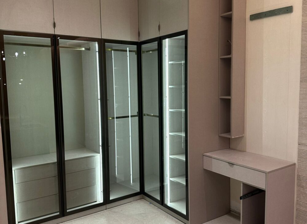 The bedroom was designed with a strong focus on functionality, clean aesthetics, and efficient use of space. A custom-built wardrobe unit became the central element of the room, combining transparent glass doors, internal shelving, and integrated drawers to provide organized storage while maintaining a light, modern appearance. A dedicated vanity unit was seamlessly integrated into […]